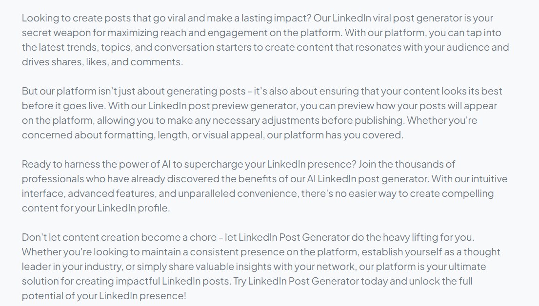 The LinkedIn Post Creator produces polished and captivating posts for LinkedIn.